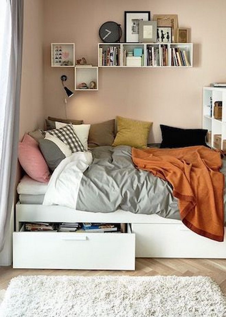 Wall-Mounted Shelves: Install floating shelves to add visual interest and provide extra storage for books, decorative items, and other belongings. Choose shelves in lighter colors to avoid making the walls feel heavy.